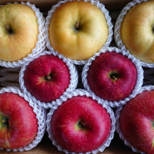 本商品は、ここ江刺で育て収穫している弊社における旬のりんごを【2種類あるいは3種類】のミックスにして、3㎏入りに箱詰めしたものになります。よって、どんな品種のりんごが入るかはお手元に届くまでお楽しみということになります。様々な味を是非ご賞味ください。