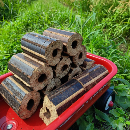もみ殻を粉砕し約300℃で高温圧縮して成形します。高温処理されるため虫の発生が無く、室内保管の場合は約10年保存可能です。素手で触っても手が汚れずらいので衛生的です。災害時の備蓄燃料としても最適です。燃焼後に残った灰は土壌改良材として家庭菜園等の土づくりに活用できます。