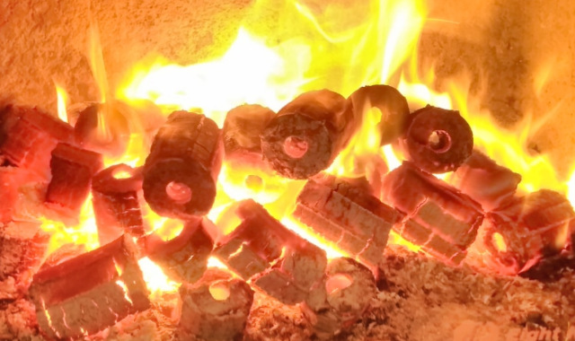 モミガライトの燃料時間は薪の2倍以上、熱量はほぼ同等です。着火後約10分程度は炎を上げて燃焼し、その後は木炭のように熾火となりゆっくり燃焼します。遠赤外線効果でハーベキューではお肉等が美味しく調理できます。薪ストーブや焚き火にも活用できアウトドアに最適です。
