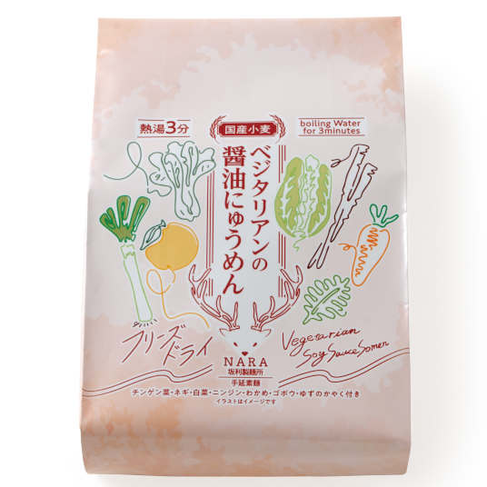 国産小麦100%の手延べそうめんをゆがき、美味しい状態をフリーズドライにしています。動物性原料不使用のスープ、かやくがセットになっている、400㏄のお湯をかけて3分待つだけの即席にゅう麺です。