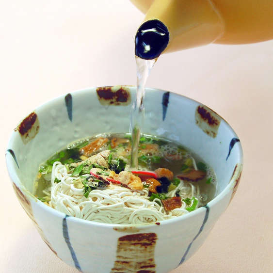国産小麦100%の手延べそうめんをゆがき、美味しい状態をフリーズドライにしています。あご出し入りの和風スープと坦々風味、それぞれに、かやくもセットされています。200㏄~のお湯をかけて3分待つだけの即席にゅう麺です。お味噌汁のお椀程度のカップでお召し上がりいただけます。