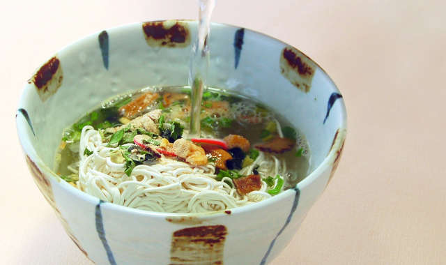沸騰している方が麺のもどりはよいですが、国際線の飛行機にも搭載していただいたことがあり、沸騰していなくても、麺はもどってまいります(味見をしてよい食感のところでおめしあがりください)