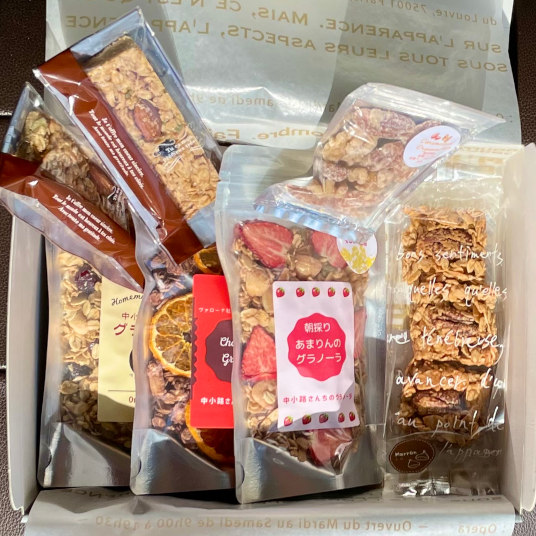 季節限定のグラノーラは、「あまりんのグラノーラ」「チョコレートのグラノーラ」「うまかんべぇトマトのイタリアングラノーラ」「みらいのグラノーラ」「大粒ブルーベリーのグラノーラ」「5種のぶどうのグラノーラ」「栗と玄米のグラノーラ」「りんごと焼き芋のグラノーラ」のうち、その季節のものどれか2種になります(季節限定が1種しかない時季には、「ほうじ茶のグラノーラ」が入ります)。