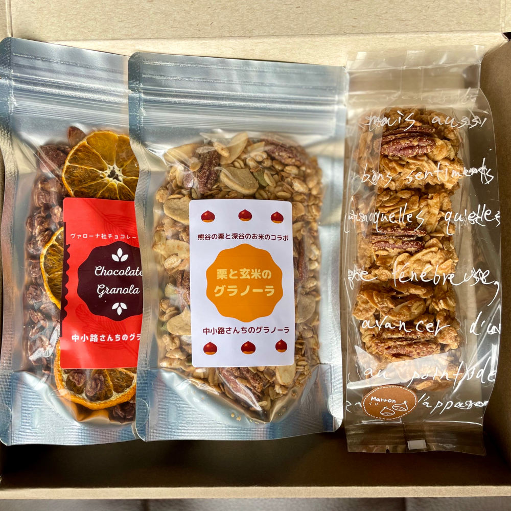 オリジナルグラノーラ(小)と季節のグラノーラ(小)、栗とピーカンナッツのグラノーラクッキーを詰め合わせたギフト3点セット。小さめのギフトセットなので、手みやげや、季節のご挨拶、お彼岸やお盆のお供えなどにも最適です。季節のグラノーラは、その時期のものがどれか1種類入ります。