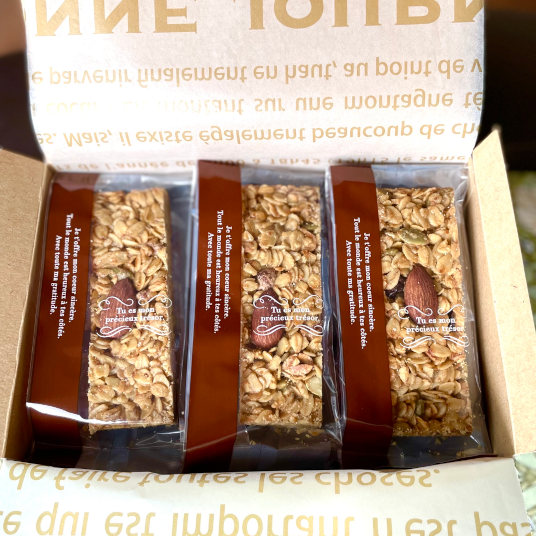 オリジナルグラノーラの材料をそのままに作ったグラノーラバー9本をコンパクトな箱に詰め合わせました。マシュマロなどはいっさい使わず、メープルシロップたっぷりで固めています。行動食に、また低GIなのでお仕事中の間食や補食にもぴったりですし、ちょっとした贈り物にも最適です。