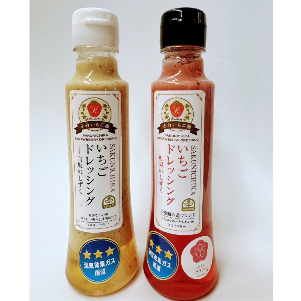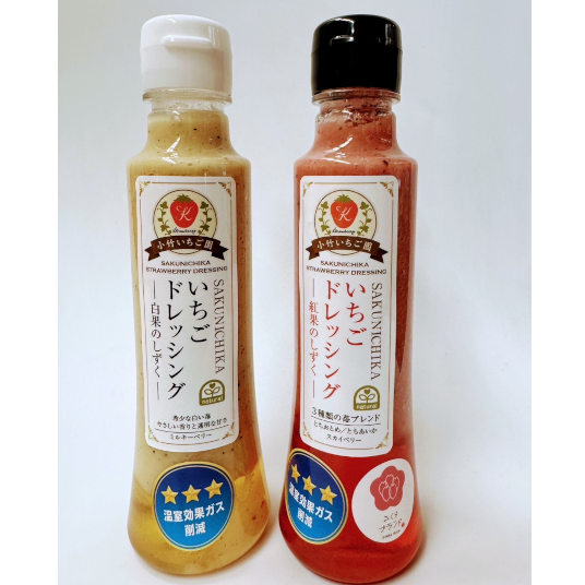 幻の白いちご(ミルキーベリー)シーザー風ドレッシングと3品種(とちおとめ、とちあいか、スカイベリー)をブレンドした赤いちごドレッシング風ドレッシング、りんご酢・植物油のバランスが絶妙で、サラダ・豚肉・カルパッチョにも好相性。