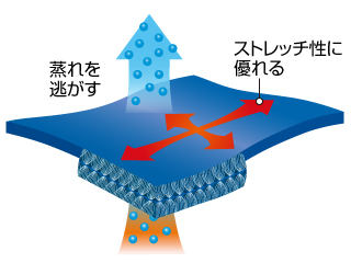 ポリウレタン繊維を交編することで、縦横2方向への優れたストレッチ性を実現したフリース素材です。裏面の起毛地が空気を多く蓄え、優れた保温性を発揮。通気性にも優れるため、運動量の多い場面でも蒸れにくく、快適な着心地が持続します。