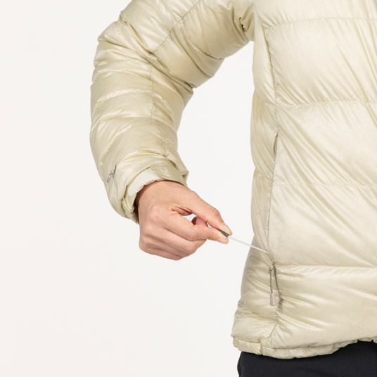 羽毛抜け防止加工は十分に施されていますが、着用中の伸縮などによって生地やステッチから羽毛が抜け出すことがあります。その際は、裏側から羽毛をつまみ、ウエア内に引き戻してください。