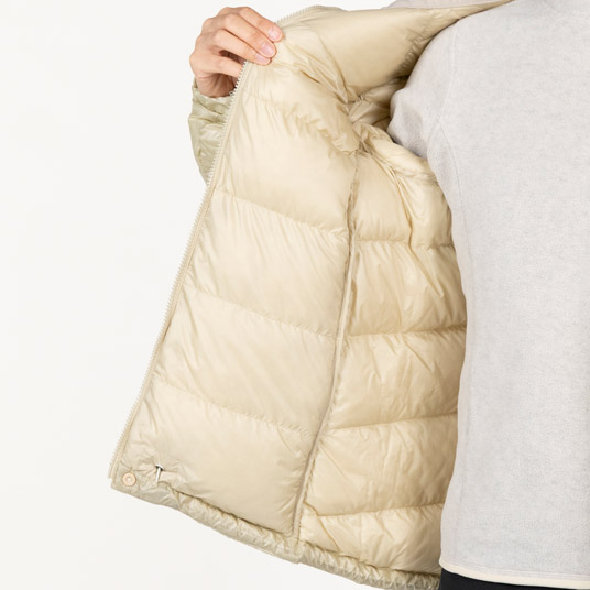 表地と裏地の間を隔壁で仕切った「箱マチ」構造。ダウンのロフト(かさ高さ)が大きく得られ、移動・片寄りを防ぎます。ダウンの保温性能を最大限に引き出します。