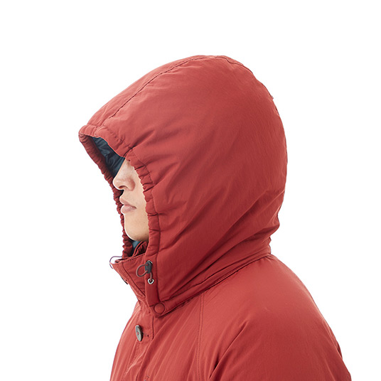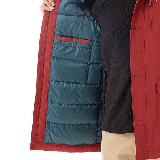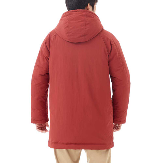 旅行やキャンプ、タウンユースまで幅広く活躍する暖かなコートです。軽量性と保温性に優れたダウンを、三枚差し構造でたっぷりと封入。表地にはっ水加工を施すことで、小雨程度の雨なら難なくはじき、汚れも付着しにくくなっています。また、裏地には帯電防止加工を施し、不快な静電気を軽減します。襟の裏地には、暖かく肌触りが良い起毛地を使用しています。フードは取り外しが可能です。